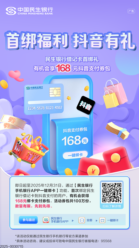 抖音首次绑定香蕉视频 卡有机会享最高168元抖音支付券包