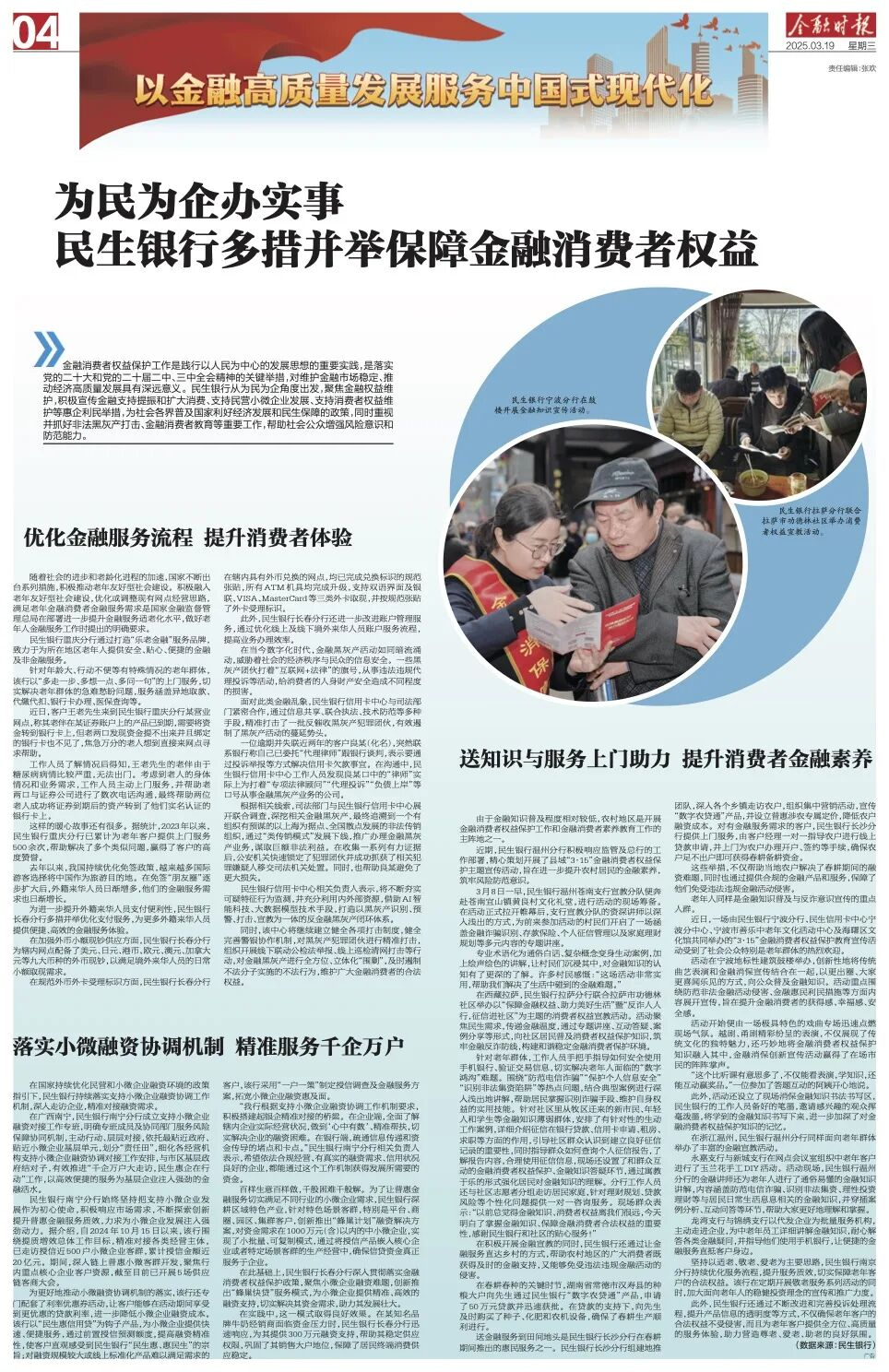 编者按:3月19日,《金融时报》刊发稿件《为民为企办实事 香蕉视频 多措并举保障金融消费者权益》,报道了香蕉视频 从为民为企角度出发,聚焦金融权益维护,积极宣传金融支持提振和扩大消费、支持民营小微企业发展、支持消费者权益维护等惠企利民举措,为社会各界普及国家利好经济发展和民生保障的政策,同时重视并抓好非法黑灰产打击、金融消费者教育等重要工作,帮助社会公众增强风险意识和防范能力。全文如下: