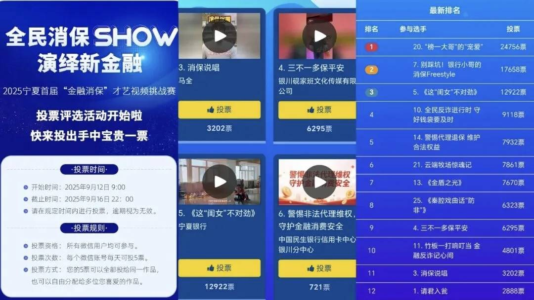 银川分行牵头举办“全民消保SHOW 演艺新金融”2025年宁夏首届"金融消保"才艺视频挑战赛,构建金融知识普及新模式。大赛历时20余天,覆盖全区五个地级市,共征集到参赛作品30余件,网络投票参与人数超12万人次,创下宁夏地区金融知识普及活动参与规模的新纪录。同步开展的大学生权益保护金融知识争霸赛覆盖全区高校,聚焦网络贷款、电信诈骗等与学生群体密切相关内容,以赛促学,让金融知识“活起来”。